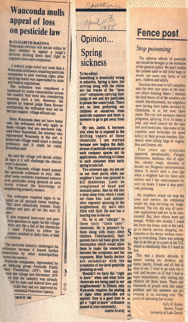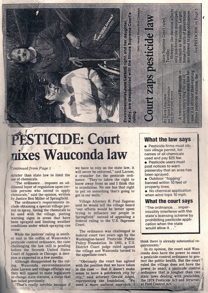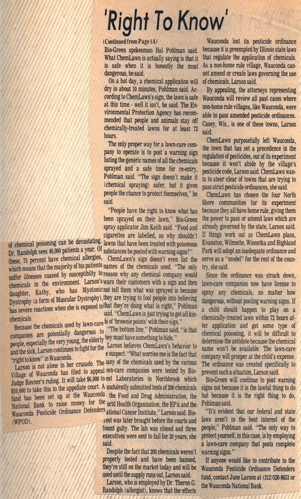 - Pushed to enact the first city ordinance requiring chemical companies to post warning signs. That law went to court battle and the ruling was that the local law was preempted by Illinois state law, but all this started a revolution in re-thinking the impact of chemicals and for companies to use less-dangerous ones around homes and communities. (see Right To Know article below for more info)