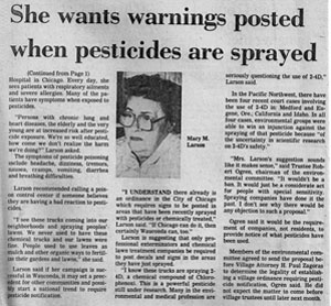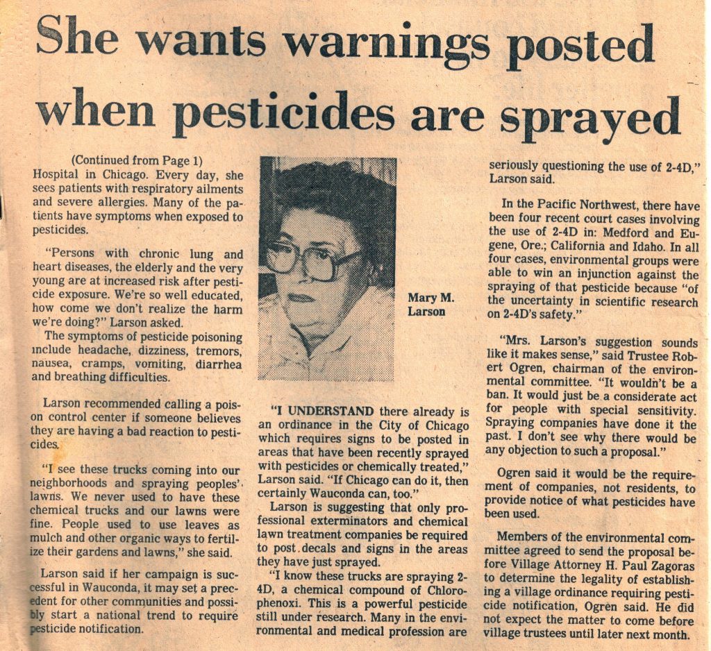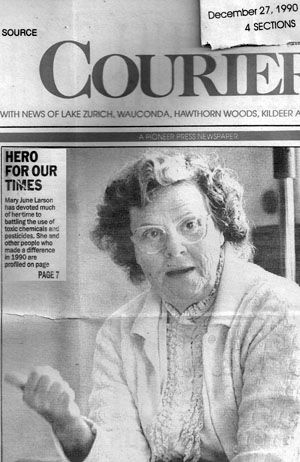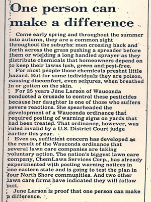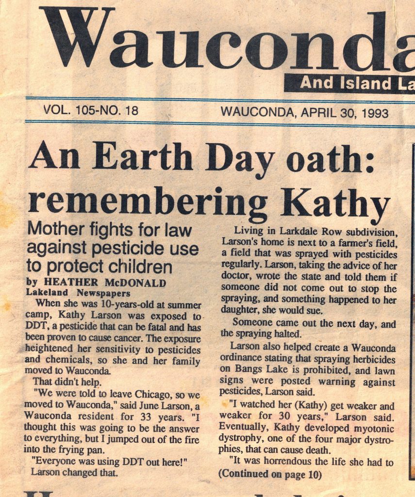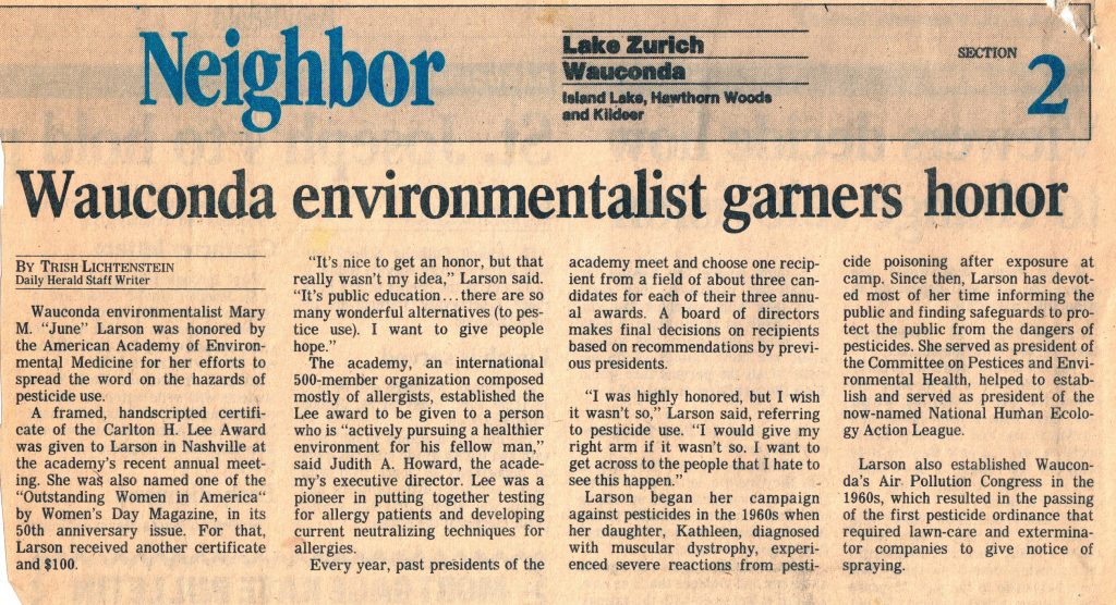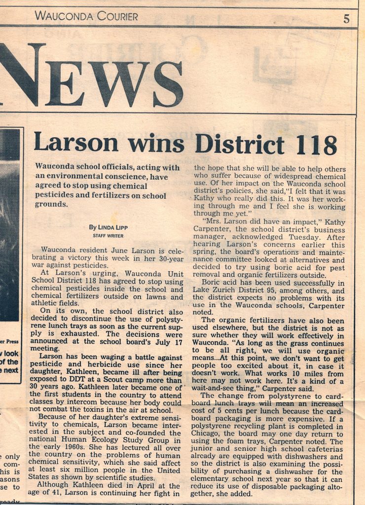 Mary and George Larson adopted a daughter soon after her birth, and when Kathy was 10 years old she attended a girl’s summer camp. She came home the first day with mosquito bites and a note pinned to her stating not to worry, the mosquito problem would be handled. DDT was sprayed while the girls played on the field the next day. This pesticide that can be fatal and has been proven to cause cancer. All people react differently to varying amounts of chemicals. For Kathy, the reaction was severe, and she became acutely sensitive to all chemicals. Mary (June) Larson spent the rest of her life, caring for Kathy, and fighting for better regulations on an unbridled chemical industry. Her purpose was to safeguard human health.