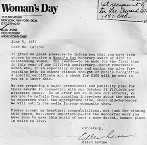 - Woman’s Day Magazine – Outstanding Women Award, 1987.