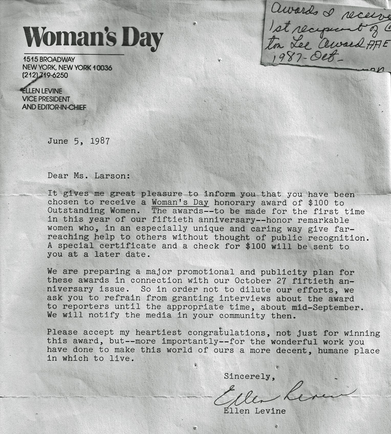 Mary Magdalene Larson, also know as Mary June Larson, was an ordinary citizen concerned about the harmful effect of chemicals, especially DDT, on humans. She received the first prestigious Carleton Lee Award in 1987 from the American Academy of Environmental Medicine.